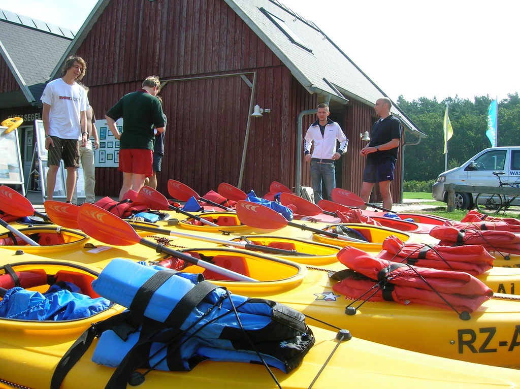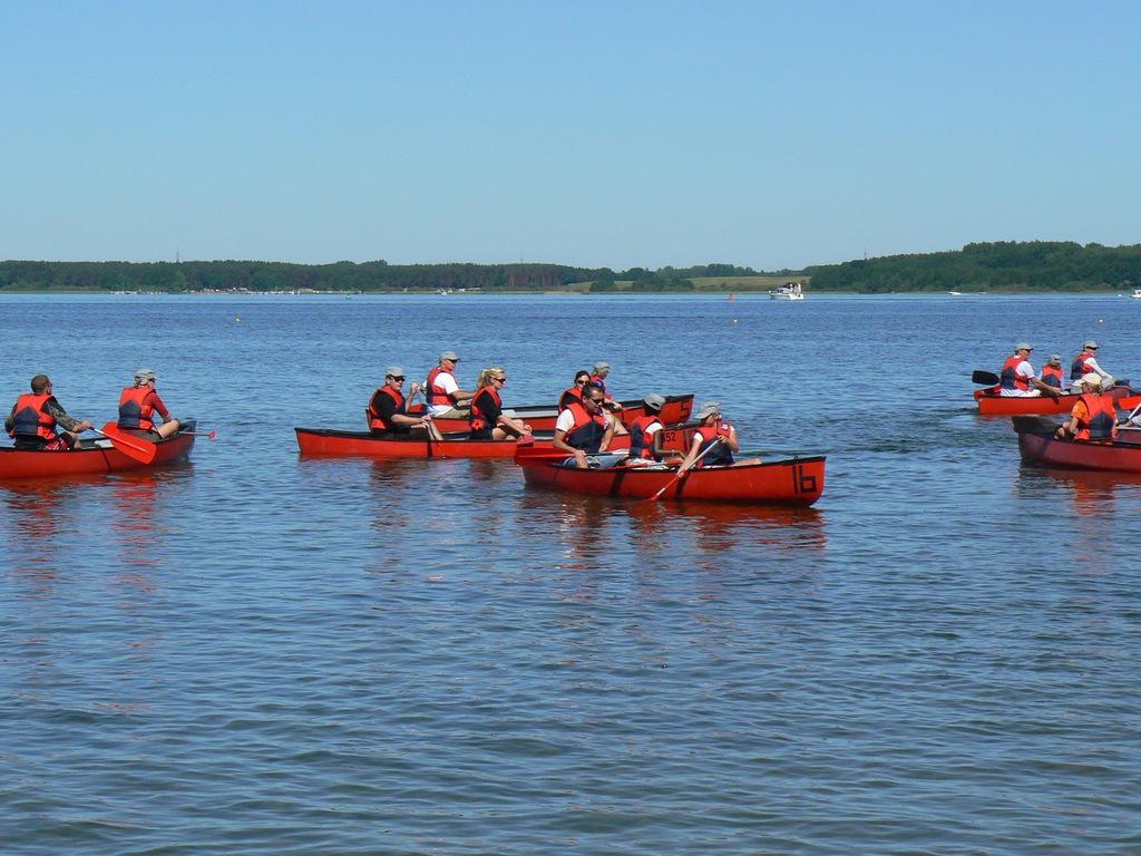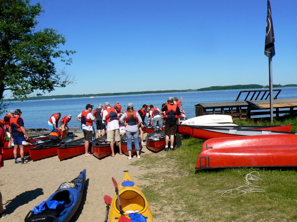 Variante 1: Die Gruppe teilt sich in zwei Gruppen, eine Gruppe fährt jeweils mit dem Rad, die andere Gruppe mit dem Kanu. In einem schönen Seecafe treffen sich die Gruppen zu einer gemeinsamen Pause.